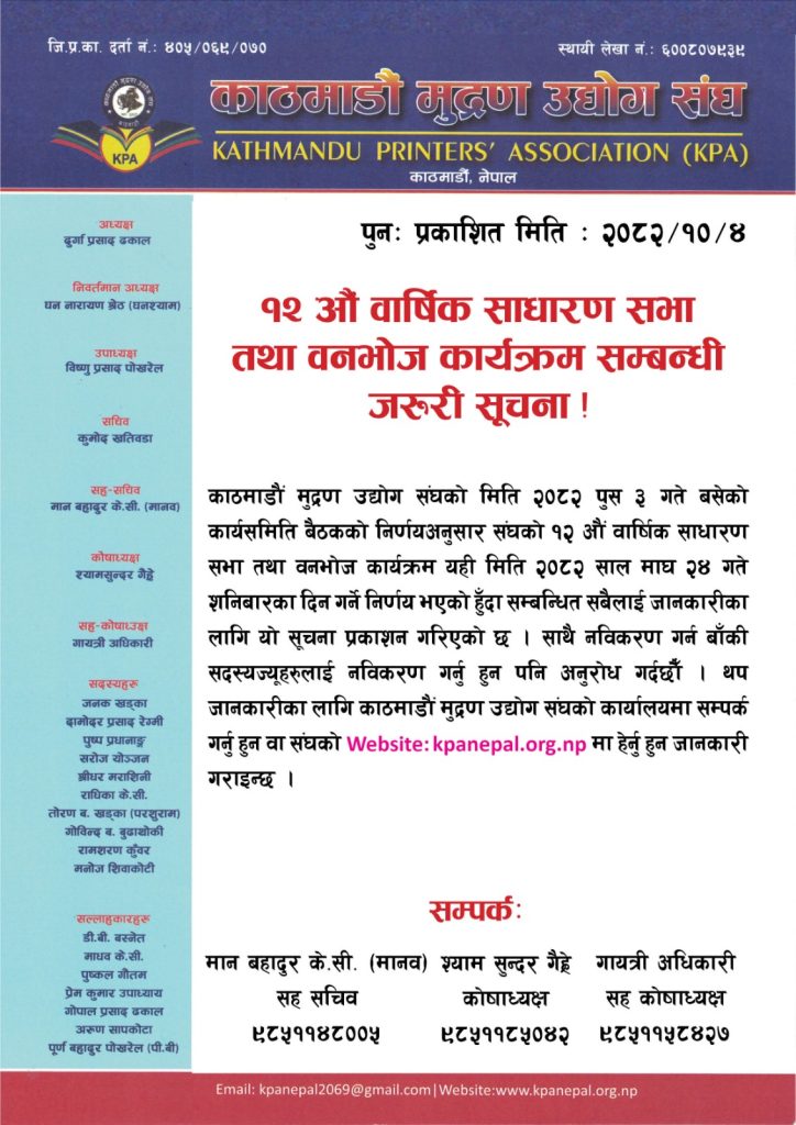 The fourth General Convention of the Kathmandu Printer’s Association (FPA), the one and only umbrella organization of the Nepalese printers, held in Kathmandu on 5th March, 2022 elected a new executive committee for two years term (2022-2024) under my chairmanship. I would like to extend my sincere thanks from my inner heart to all the representatives, observers, election committee members staffers, and many other several immanent personalities for their active participation and engagement to make the convention a great success.